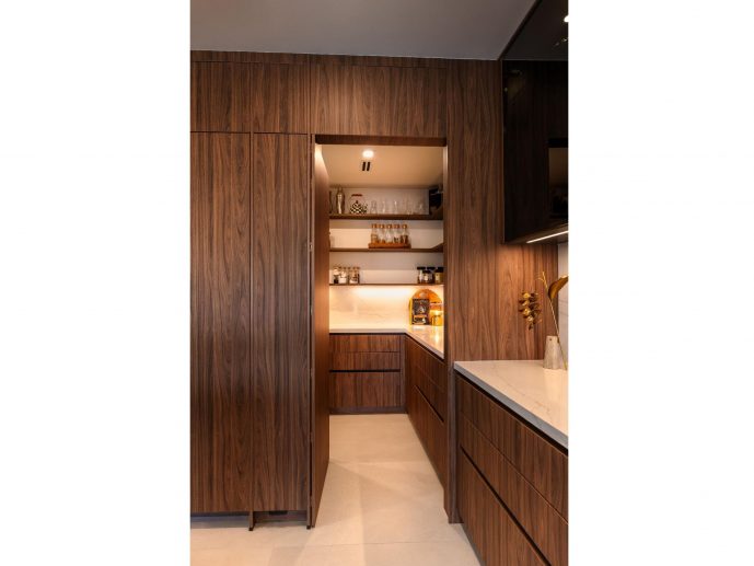 To further enhance its floating appearance, the cabinetry features under-cabinet LED lighting and a wraparound channel handle at the island. Additional highlights include a paneled wine cooler and a hidden walk-through pantry. As an extension of the kitchen’s design, the pantry features an inward opening door and matching cabinetry throughout, along with thoughtfully placed lighting elements to reinforce a sense of harmony.