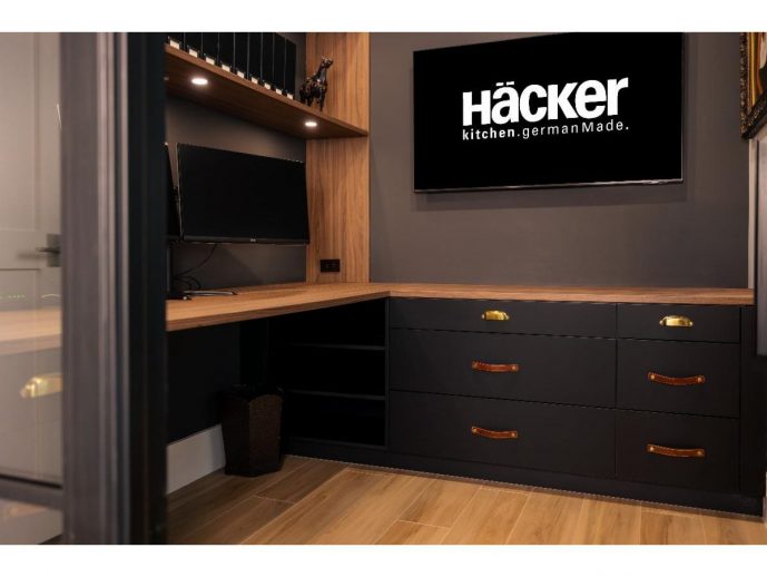 For the office and second floor serving areas, Häcker Kitchens’ AV 2135 PerfectSense® in Black was selected to create a striking yet refined aesthetic. This premium surface finish combines a high-end appearance with practical durability, resulting in spaces that look, feel and perform at a superior level. Engineered for everyday life, PerfectSense® is resistant to fingerprints, light/UV exposure, heat, water and stains, maintaining a flawless appearance while remaining easy to clean, making it the ideal selection for these areas of the home.