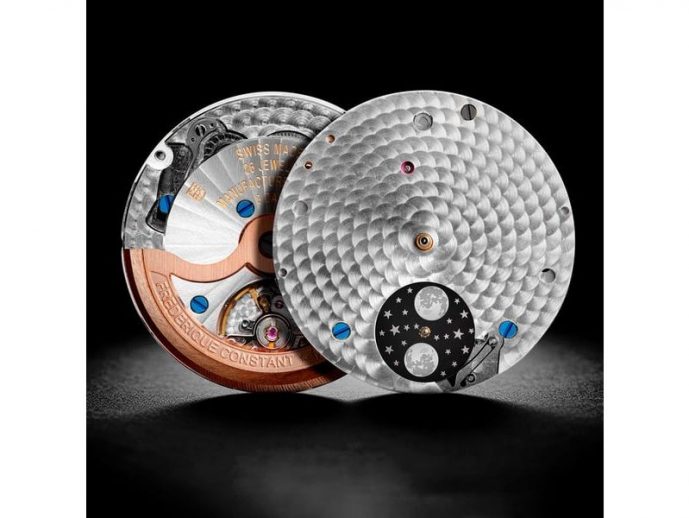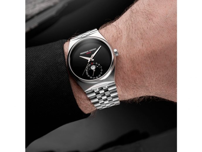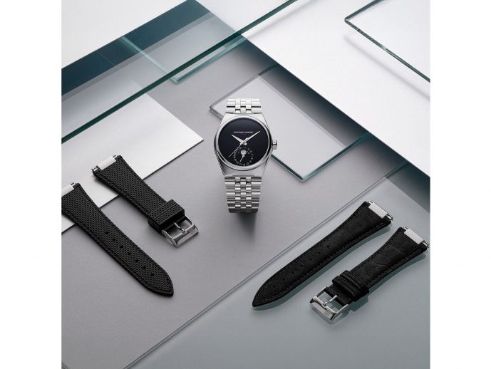 This striking new model is the first Highlife to feature a Frederique Constant Manufacture Moonphase, the first to come with an integrated five-link bracelet, and the first Frederique Constant watch ever to have a dial without hour markers.