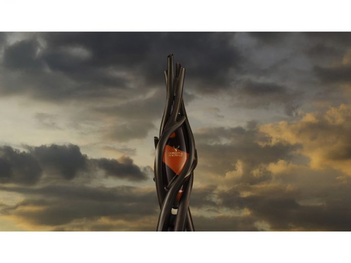 "Standing tall and strong, the patinated bronze entwines the vessel, suspending it while revealing the amber colour of the whisky within. Together, the elements depend on and complement each other, in a reciprocal dance whose form, like the whisky it holds, is a product of both natural growth and the nature of its materiality," expresses Gang.