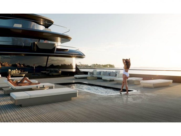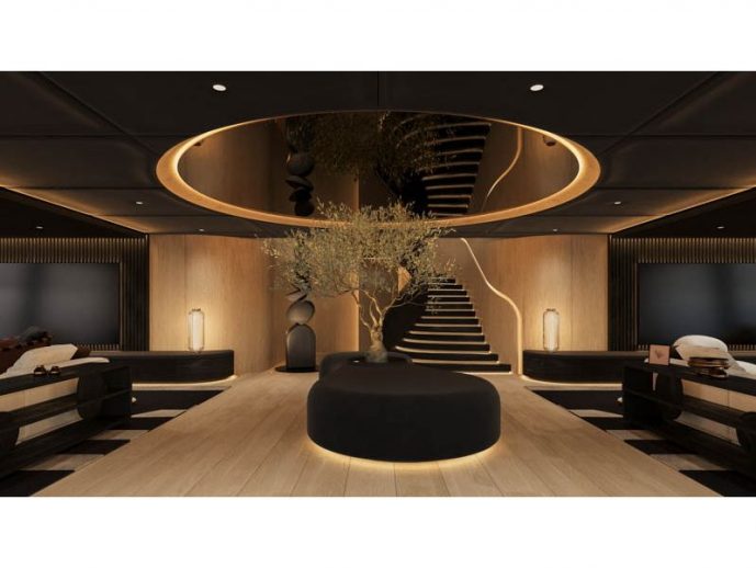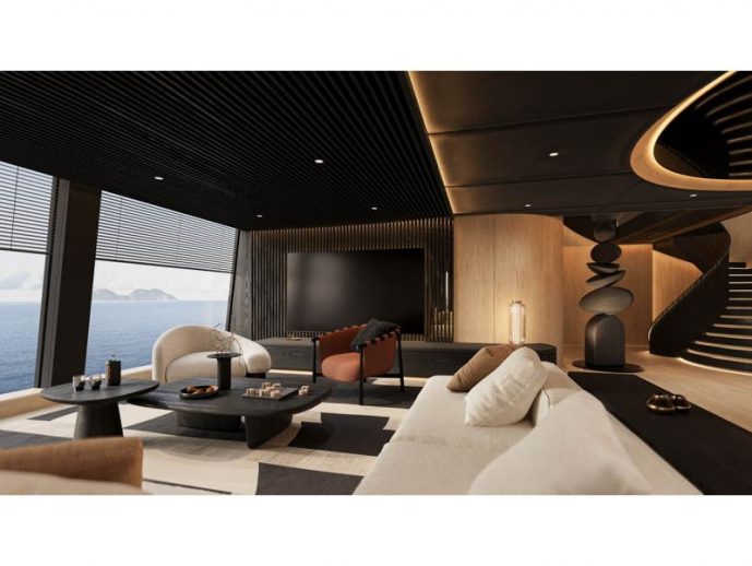 Social spaces include formal and informal dining areas, panoramic lounges, a moon-shaped bar on the bridge deck, and extensive sun terraces. A 6m aft pool and Jacuzzi deck highlight the yacht’s outdoor lifestyle, perfect for entertaining or relaxation.
