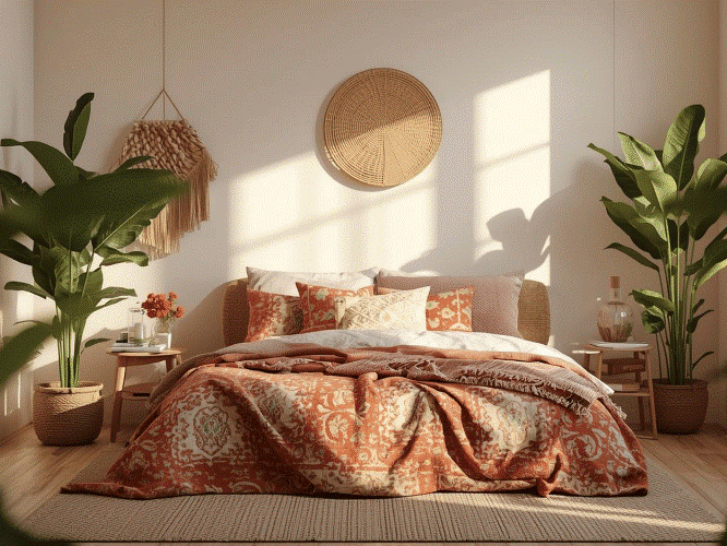 Bold patterns and bright colors are used sparingly. The focus is on creating a sense of harmony rather than making the bed the sole focal point.