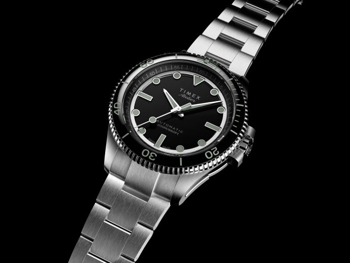 The launch timepiece, the Timex Atelier Marine M1a, embodies this philosophy. Its 41mm stainless-steel case features a skeletonized architecture with a black IP-coated middle case, screw-down crown, and 200M water resistance all framed under a double-curved sapphire crystal treated with triple-layer anti-reflective coating. A unidirectional rotating bezel is fitted with a black ceramic insert, Swiss Luminova, and elapsed time index. Beneath it, a polished black enamel dial reveals silver-applied indices and hands filled with Swiss Luminova for clarity at all hours.