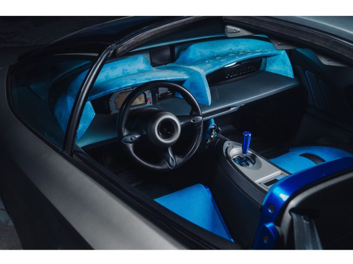 The interior is equally fighter jet-inspired, with glass screens, aviation-style seats trimmed in Azure Blue Alcantara, fibre-optic lighting and rear-view cameras. A Formula One-derived Magneti Marelli digital instrument cluster provided essential information and the Pregunta was fitted with an Alpine audio system.