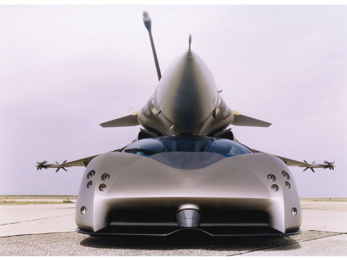 It features carbon fibre bodywork by Heuliez, with vast air intakes that mimic those of the fighter jet. So too do the canopy-like scissor doors, the wraparound glass and the same Matte Grey paint of the Rafale.