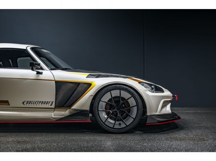 The wheels too blend old and new in a connoisseur’s delight debuting a brand new forged wheel fresh off of the 5-axis CNC machining. The BP-RW Evolution in 19x11+27 sizing. The wheel’s new design is inspired by Japanese Tsuchime, a hammered metal technique often found in kitchenware and knives. The BP-RW borrows from the ultra high strength and highly efficient UP-RW from Bulletproof Automotive’s sister company Unplugged Performance. However the similarities stop with the addition of spoke-side cuts, deep concavity, tsuchime detailing, and custom finishes which enable the one-off BP-RW to be suitable for this S2000 as well as appropriate on Porsche, Lamborghini, Ferrari and other performance vehicles. The pinnacle of modern aerodynamics meet classical japanese knife making aesthetics to produce a wheel that is strong, light, aerodynamic, modern and vintage all in one ultra-durable package.