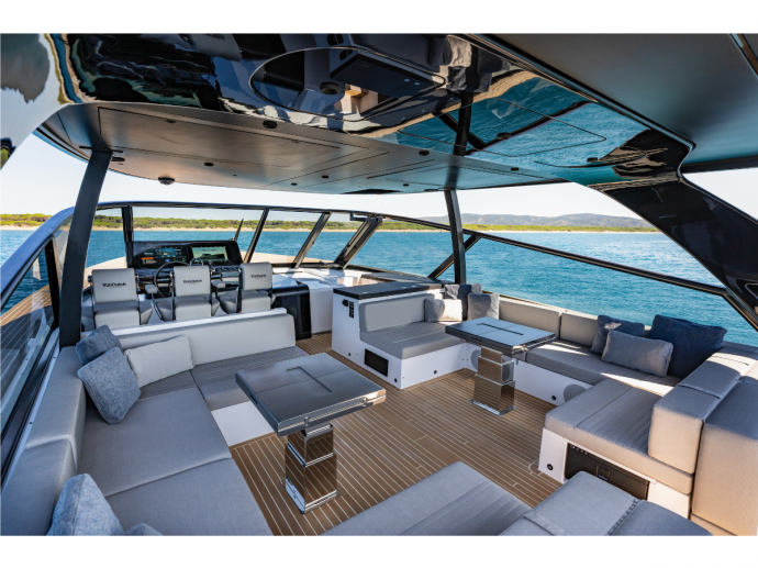 Among the noteworthy new features is the carbon fiber Hard-Top, designed to protect the lounge area while preserving the harmony of the yacht’s lines. Its seamless integration into the boat’s profile avoids excessive vertical volume and helps maintain the minimalist and dynamic aesthetic that defines the VanDutch identity.