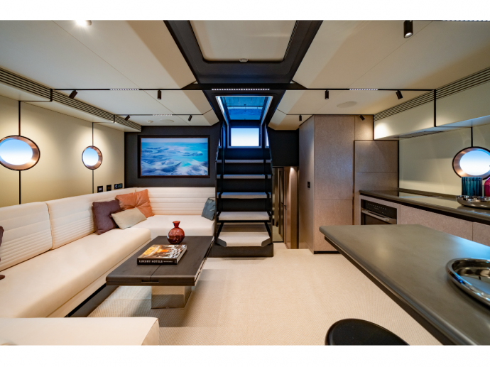 The VanDutch 75 sets the tone for a new stylistic era. Several elements introduced on this model will shape the future VanDutch “family identity”. Among them: the signature hull-side window that enhances the profile with a refined decorative touch; the horizontal lacquered slat ceiling panels that elegantly conceal the air conditioning system; and the custom-designed track lighting, specifically developed for marine use.