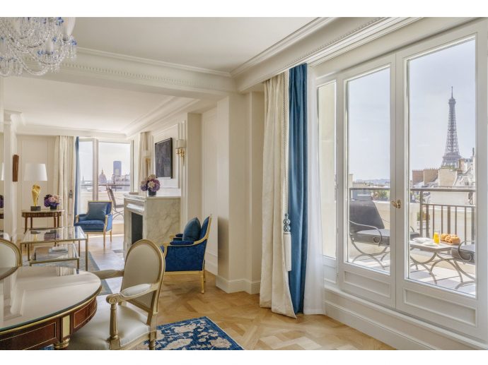 Through a palette of soft, harmonious tones, the interiors have been reimagined with refined lines and expanded perspectives. Natural light is enhanced throughout the property, while new French windows frame breathtaking views of Paris. Select suites now offer panoramas of the Eiffel Tower, with daylight flooding into the rooms to create an atmosphere of serenity.