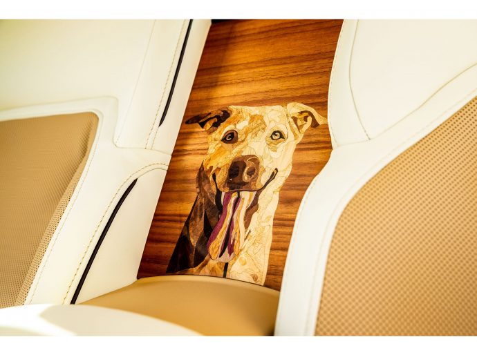 The centrepiece of the interior is a lifelike marquetry portrait of Bailey, positioned on the waterfall between the rear seats. The intricate composition took more than four months to complete and comprises more than 180 pieces of veneer. To capture the warmth and texture of Bailey’s coat, the artisan explored a rich spectrum of natural veneers, experimenting with grain direction, tone, and texture. Each sheet was chosen for its natural hue and pattern, with no staining or artificial treatment. Bailey’s tongue alone was crafted using four veneers never previously employed by Rolls-Royce – Purple Heart, Tulipwood, Louro Faia, and Pear – selected for their subtle colour variations. In total, nine veneers were used, representing 22 natural shades, to create a portrait of remarkable warmth and realism.