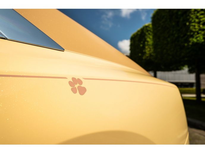 For Spectre Bailey, paint specialists at the Home of Rolls-Royce in Goodwood developed an iridescent two-tone finish, combining paint colours reserved exclusively for the commissioning clients. The main body is finished in Crystal Fusion over Beautiful Bailey, a hue inspired by the soft fur on Bailey’s ear; the upper section gleams in Crystal Fusion, a dynamic, iridescent finish that shifts subtly with the light. The shoulder Coachline features an exact reproduction of Bailey’s paw print, hand-painted in Rose Gold to match the Spirit of Ecstasy figurine.