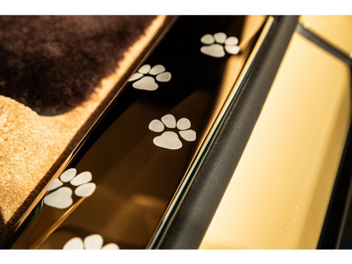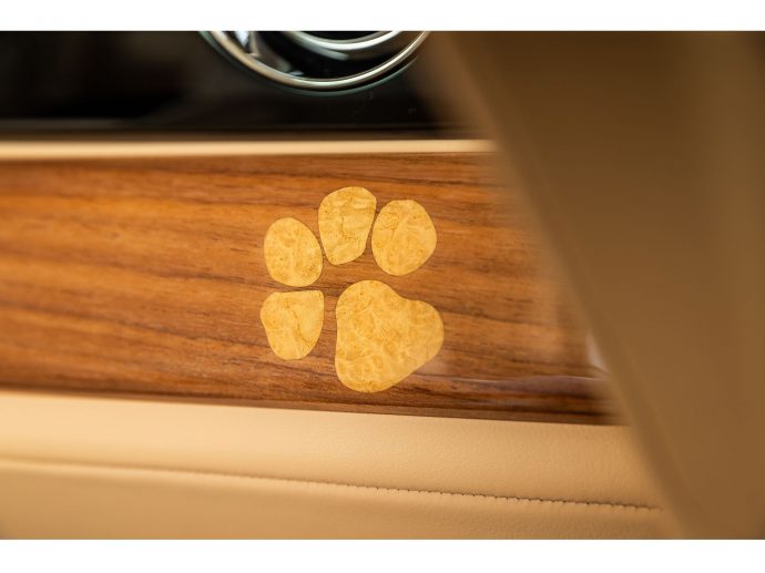 On the passenger side of the dashboard, a smaller marquetry motif offers another tribute to Bailey, depicting a precise recreation of his paw print. This design also appears as an engraving on the surround of the Bespoke Rose Gold treadplates on the door sills, revealed in a moment of quiet delight when the doors are opened.