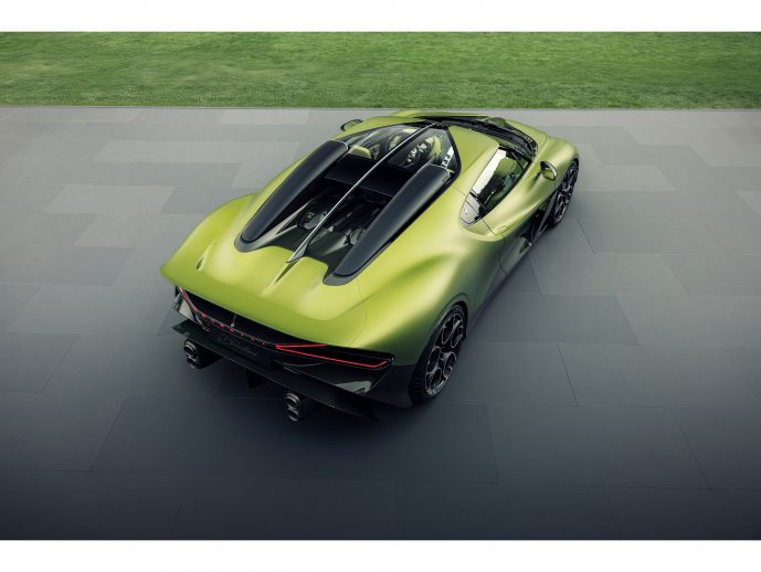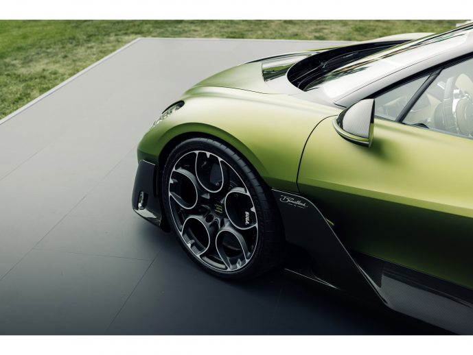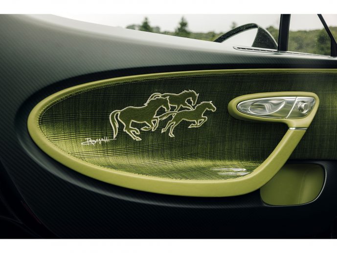 Artistry of a different kind defines the interior of the hypercar, with the richness of its quality evident in every detail. Complementing a hand-crafted sculpture of Brouillard in the gear selector, embroidered horse motifs adorn the door panels and back seats – both of which come together in a weave of custom-crafted, tartan fabrics sourced from Paris. In the spirit of the City of Light, a rich green-tinted carbon weave pairs elegantly with the shine of aluminum detailing, with a crystal-clear glass roof delivering an uplifting sense of space and cathedral-esque grandeur.