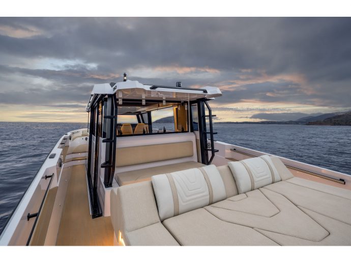 That versatility is perfectly encapsulated in the central superstructure. On the one hand, it forms the perfect luxury bubble for inclement weather or off-season, high-latitude adventures, with a comprehensive forward helm plus three comfortable helm chairs, and an aft settee with table, among other configuration options to suit the need for more helm or lounge seats. On the other, the doors slide away towards the aft, the roof slides back and the large aft window opens to create a glorious inside-outside space that’s perfect for lazy summer days and warm-weather blasts. Both modes are also ideal for hot climates where ventilation and connection to the outside are desired but some protection from the sun (or showers of rain) is required.