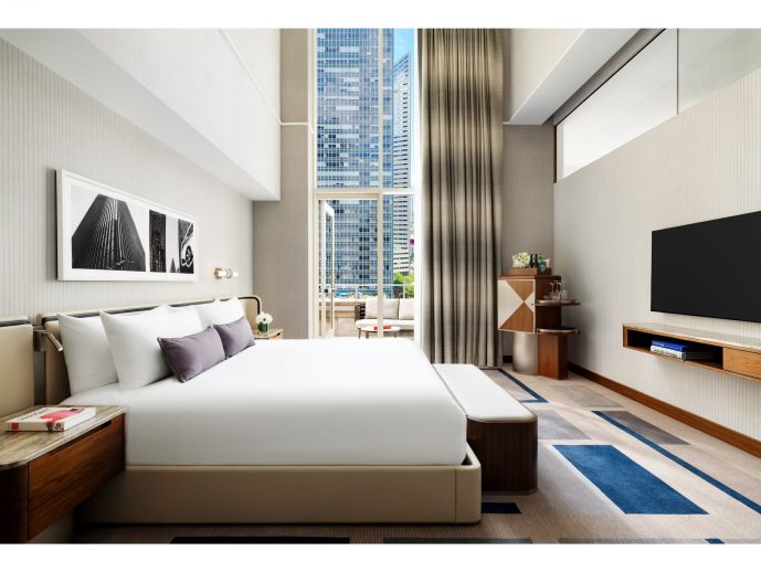 Each guestroom is thoughtfully designed for the modern traveler, featuring a soft, contemporary palette of neutrals, navy, and sage that sets a more serene tone. Custom European walnut paneling, velvet and leather furnishings, and geometric carpets add texture and warmth throughout the space. Shifting from the prior design scheme of darker tones, comfortable furnishings are imbued with a contemporary and softer color palette of creams, blues and greens. Custom furniture designs reinforce a residential atmosphere, highlighted by a sculptural swivel chair, redesigned étagère, and a vanity with integrated overhead lighting. Rich textures, such as European walnut, travertine surfaces, velvet sofas, and cream leather headboards, combine with tailored pinstripe wallcoverings and bespoke carpeting to create a refined canvas. Consistent with The Joule's brand expression, art is integral to the new guestroom design, with black and white photographic diptychs by Bram Tihany creating a striking visual dialogue that invites guests into a narrative of form, contrast, and connection.