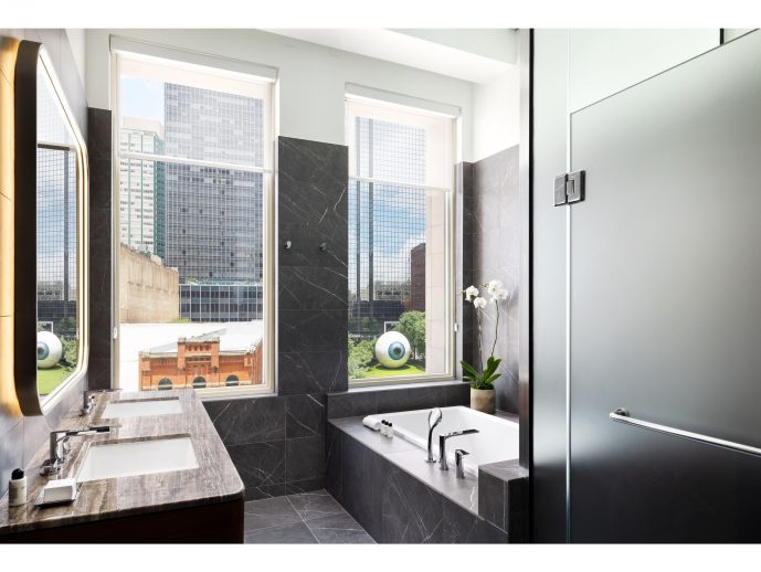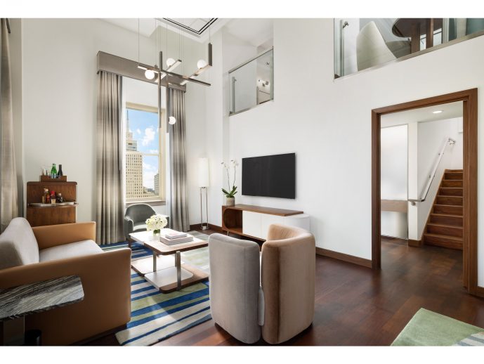The extensive renovation extends beyond guestrooms and into the corridors, which feature coordinating pinstripe wallcoverings, new decorative lighting, and a curated collection of original photography showcasing iconic Dallas architecture. The artwork, also curated by Bram Tihany and Theory Engine Inc., is exclusive to The Joule and enhances the visual journey throughout the hotel.