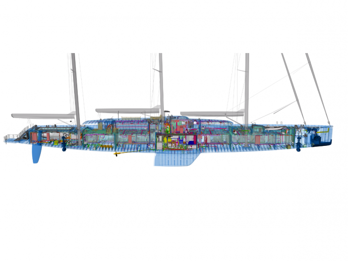 TRIDENT 810 has dramatic and purposeful contemporary lines with a plumb bow. She is designed by Dykstra Naval Architects and Mark Whiteley Design. The very long waterline and powerful Panamax rig of TRIDENT 810 ensure effortless, mile-eating performance. Despite her massive sail area (upwind: 2,580sqm / 27,770sqft), all three mainsails can be hoisted simultaneously in no more time than it would take to hoist the sails on a yacht half her size. The efficiency of this advanced sail management system reflects the immense technical innovation behind it.