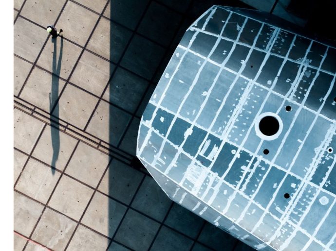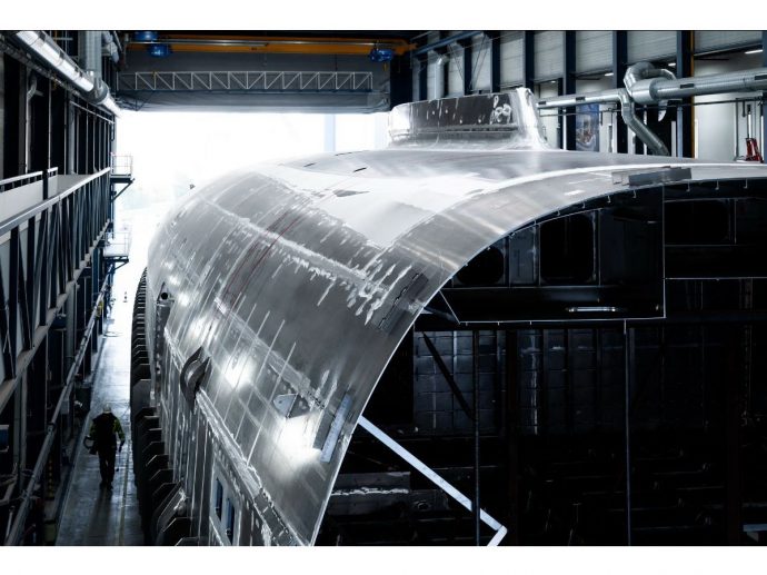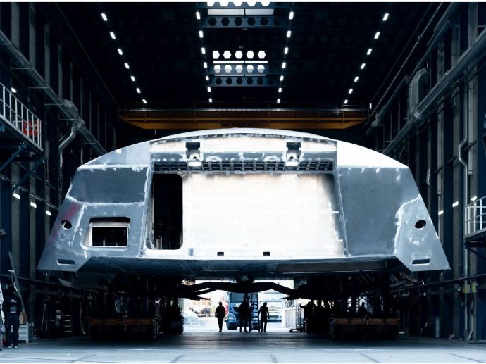 A hallmark moment in any superyacht build, the hull turning reveals the true scale of Project 412 and marks the transition from primary structure to the next phases of outfitting and systems integration. She will be a super-sized 81m / 266ft sailing yacht. The aluminum hull construction features a distinctive chine from bow to stern. Created for a true sailing experience and world cruising, the contemporary flybridge schooner will be equipped with a state-of-the-art carbon rig supplied by Rondal, combining performance with sail-handling comfort and innovation.